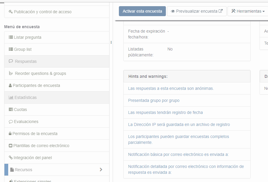Tengo un problema al querer agregar archivos a una encuesta, al dar clic en recursos, se queda como a continuación se muestra. He intentado con Edge, Chrome, Opera y Firefox, y en todos los casos resulta lo mismo.
