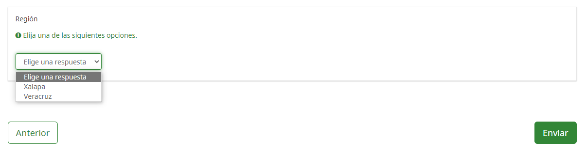 Es decir, tengo una pregunta Región, con opciones de respuesta Xalapa y Coatepec, por lo que al elegir una de ellas, me mande a su página de gobierno por así decirlo.