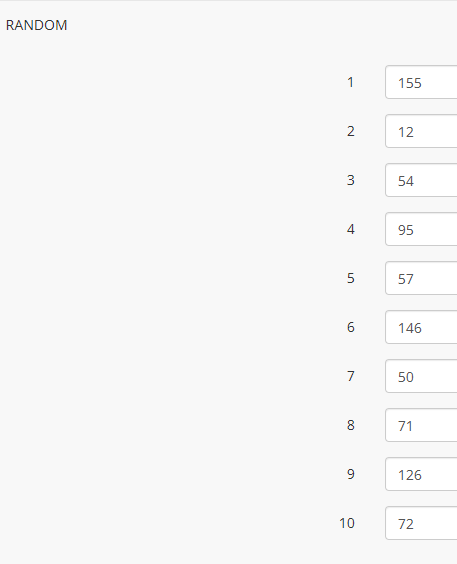 <script type="text/javascript" charset="utf-8"> function shuffle(array) { var currentIndex = array.length, temporaryValue, randomIndex; // While there remain elements to shuffle... while (0 !== currentIndex) { // Pick a remaining element... randomIndex = Math.floor(Math.random() * currentIndex); currentIndex -= 1; // And swap it with the current element. temporaryValue = array[currentIndex]; array[currentIndex] = array[randomIndex]; array[randomIndex] = temporaryValue; } return array; } $(document).on('ready pjax:scriptcomplete',function(){ // Fill the array var arr = []; for (var i = 1; i < 201; i++) { arr.push(i); } arr = shuffle(arr); $('#question{QID} input[type="text"]:eq(0)').val(arr[0]); $('#question{QID} input[type="text"]:eq(1)').val(arr[1]); $('#question{QID} input[type="text"]:eq(2)').val(arr[2]); $('#question{QID} input[type="text"]:eq(3)').val(arr[3]); $('#question{QID} input[type="text"]:eq(4)').val(arr[4]); $('#question{QID} input[type="text"]:eq(5)').val(arr[5]); $('#question{QID} input[type="text"]:eq(6)').val(arr[6]); $('#question{QID} input[type="text"]:eq(7)').val(arr[7]); $('#question{QID} input[type="text"]:eq(8)').val(arr[8]); $('#question{QID} input[type="text"]:eq(9)').val(arr[9]); // Elimina los "//" después de la prueba para esconder la pregunta. // $('#question{QID}').hide(); }); </script>