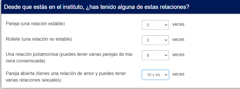 <script type="text/javascript" charset="utf-8"> $(document).on('ready pjax:complete',function() { var qID = {QID}; var inputNum = 0; // Define the select element (dropdown) var prov1 = '<select id="prov1" class="form-control">\ <option value="">...</option>\ <option value="0">0</option>\ <option value="1">1</option>\ <option value="2">2</option>\ <option value="3">3</option>\ <option value="4">4</option>\ <option value="5">5</option>\ <option value="6">6</option>\ <option value="7">7</option>\ <option value="8">8</option>\ <option value="9">9</option>\ <option value="10">10 y mas</option>\ </select>'; // Hide the text input $('#question'+qID+' .question-item:eq('+(inputNum)+') input[type="text"]').hide(); $('#question'+qID+' .question-item:eq('+(inputNum+1)+') input[type="text"]').hide(); $('#question'+qID+' .question-item:eq('+(inputNum+2)+') input[type="text"]').hide(); $('#question'+qID+' .question-item:eq('+(inputNum+3)+') input[type="text"]').hide(); // Insert the select elements if($('#question'+qID+' .question-item:eq('+(inputNum)+') select').length == 0) { $('#question'+qID+' .question-item:eq('+(inputNum)+') input[type="text"]').before(prov1); } if($('#question'+qID+' .question-item:eq('+(inputNum+1)+') select').length == 0) { $('#question'+qID+' .question-item:eq('+(inputNum+1)+') input[type="text"]').before(prov1); } if($('#question'+qID+' .question-item:eq('+(inputNum+2)+') select').length == 0) { $('#question'+qID+' .question-item:eq('+(inputNum+2)+') input[type="text"]').before(prov1); } if($('#question'+qID+' .question-item:eq('+(inputNum+3)+') select').length == 0) { $('#question'+qID+' .question-item:eq('+(inputNum+3)+') input[type="text"]').before(prov1); } // Initially select an option if the question has already been answered $('#question'+qID+' select').each(function(i) { if($.trim($(this).next('input[type="text"]').val()) != '') { $(this).val($.trim($(this).next('input[type="text"]').val())); } }); // Listener on the dropdowns - insert selected values into hidden text input $('#question'+qID+' select').change(function() { var thisInput = $(this).next('input[type="text"]'); $(thisInput).val($(this).val()); checkconditions($(thisInput).attr('value'), $(thisInput).attr('name'), 'text'); }); // Some styles $('#question'+qID+' select').css({ 'margin':'0.3em 0 0 0' }); }); </script>