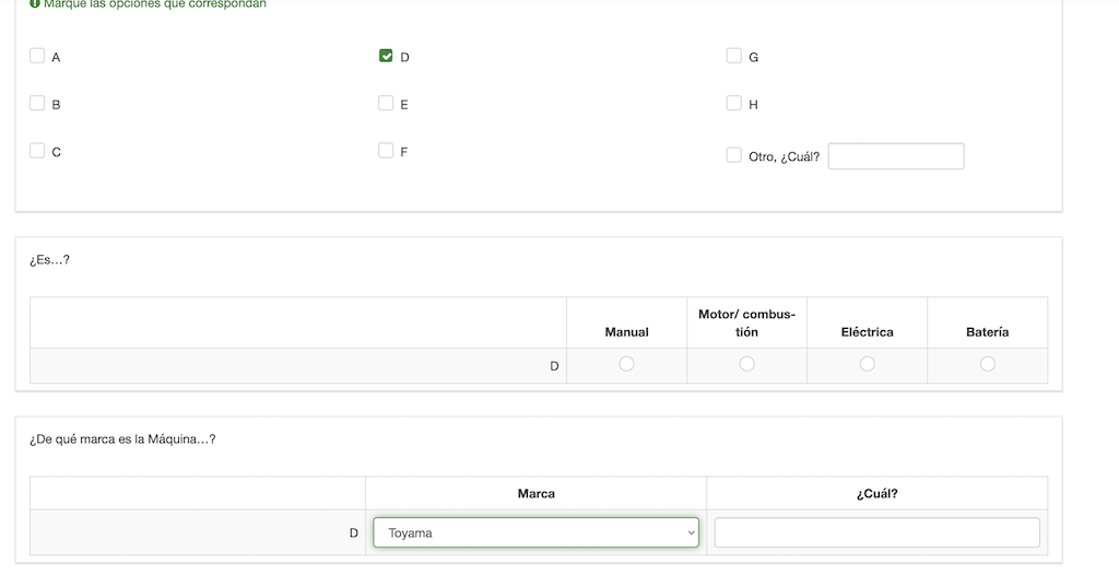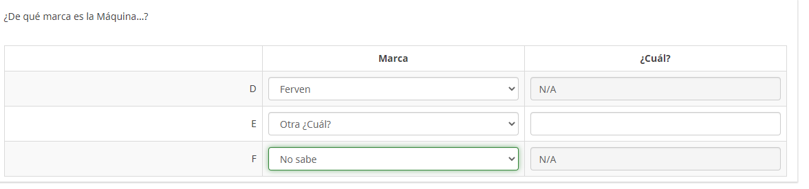 // Listeners $('.inserted-select', thisQuestion).on('change', function(i) { if($(this).val() != '') { $(this).closest('.answer-item').find('input:text').val($.trim($('option:selected', this).text())).trigger('change'); } else { $(this).closest('.answer-item').find('input:text').val('').trigger('change'); } // 2nd column conditional on 1st column if($(this).closest('.answer-item').hasClass('answer_cell_X001')) { handleColumnX002($(this)); } }); function handleColumnX002(thisSelect) { var thisRow = $(thisSelect).closest('tr.subquestion-list'); var item2 = $('.answer_cell_X002', thisRow); if($(thisSelect).val() == '17') { $('input:text', item2).val('').prop('readonly', false).trigger('change'); } else { $('input:text', item2).val('N/A').prop('readonly', true).trigger('change'); } }