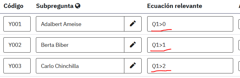 ,"Febrero y Enero",if(Q1_Y002==4,"Marzo y Febrero",if(Q1_Y002==5,"Abril y Marzo",if(Q1_Y002==6,"Mayo y Abril",if(Q1_Y002==7,"Junio y Mayo",if(Q1_Y002==8,"Julio y Junio",...)))))}<script type="text/javascript" charset="utf-8"> $(document).on('ready pjax:complete',function() { var qID = {QID}; var inputNum = 2; // Define the select element (dropdown) var prov1 = '<select id="prov1" class="form-control">\ <option value="">--Elije el mes--</option>\ <option value="1">enero</option>\ <option value="2">febrero</option>\ <option value="3">marzo</option>\ <option value="4">abril</option>\ <option value="5">mayo</option>\ <option value="6">junio</option>\ <option value="7">julio</option>\ <option value="8">agosto</option>\ <option value="9">septiembre</option>\ <option value="10">octubre</option>\ <option value="11">noviembre</option>\ <option value="12">diciembre</option>\ </select>'; // Hide the text input $('#question'+qID+' .question-item:eq('+(inputNum-1)+') input[type="text"]').hide(); // Insert the select elements if($('#question'+qID+' .question-item:eq('+(inputNum-1)+') select').length == 0) { $('#question'+qID+' .question-item:eq('+(inputNum-1)+') input[type="text"]').before(prov1); } // Initially select an option if the question has already been answered $('#question'+qID+' select').each(function(i) { if($.trim($(this).next('input[type="text"]').val()) != '') { $(this).val($.trim($(this).next('input[type="text"]').val())); } }); // Listener on the dropdowns - insert selected values into hidden text input $('#question'+qID+' select').change(function() { var thisInput = $(this).next('input[type="text"]'); $(thisInput).val($(this).val()); checkconditions($(thisInput).attr('value'), $(thisInput).attr('name'), 'text'); }); // Some styles $('#question'+qID+' select').css({ 'margin':'0.3em 0 0 0' }); }); </script>