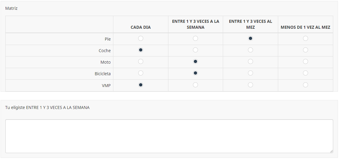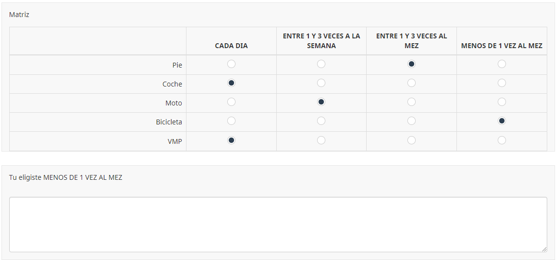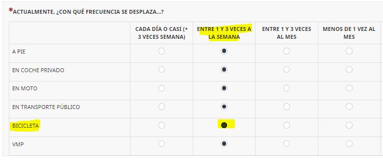 En este caso, tengo una subpregunta llamada "BICICLETA" y luego diferentes opciones de respuesta.