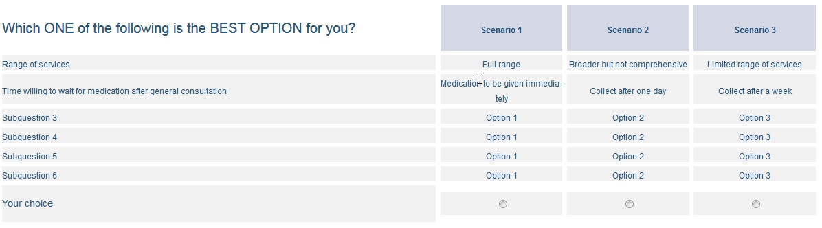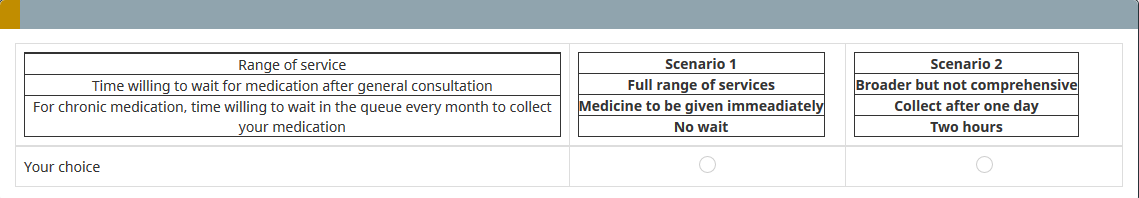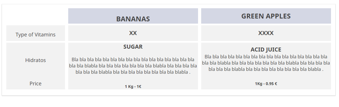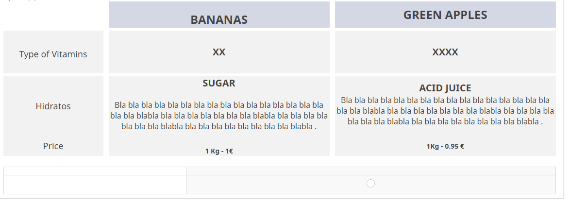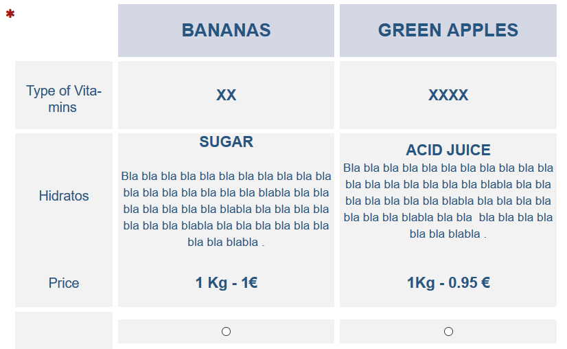 <table border="0" cellpadding="0" cellspacing="0" style="border-collapse:collapse;"> <tbody> <tr> <td style="text-align: center;" width="0%"> </td> <td style="text-align: center;" width="0%"> </td> <td bgcolor="#D4D7E4" style="text-align: center;" width="40%"><br /> <span style="font-size:24px;"><strong>BANANAS</strong></span><br /> </td> <td style="text-align: center;" width="0%"> </td> <td bgcolor="#D4D7E4" style="text-align: center;" width="40%"><span style="font-size:24px;"><strong>GREEN APPLES</strong></span></td> </tr> <tr style="height: 6px; text-align: center;"> </tr> <tr> <td bgcolor="#f2f2f2" style="text-align: center;"> <p><span style="font-size:12px;"> </span><br /> <span style="font-size:18px;">Type of Vitamins</span><span style="font-size:12px;"> </span></p> </td> <td style="text-align: center;" width="0%"> </td> <td bgcolor="#f2f2f2" style="text-align: center;"> <p> </p> <div><span style="font-size:20px;"><strong>XX</strong></span></div> <p> </p> </td> <td style="text-align: center;" width="0%"> </td> <td bgcolor="#f2f2f2" style="text-align: center;"><span style="font-size:20px;"><strong>XXXX</strong></span></td> </tr> <tr style="height: 6px; text-align: center;"> </tr> <tr> <td bgcolor="#f2f2f2" style="text-align: center;"><span style="font-size:18px;">Hidratos</span></td> <td style="text-align: center;" width="0%"> </td> <td bgcolor="#f2f2f2" style="text-align: center;"> <p><span style="font-size:20px;"><strong>SUGAR</strong></span><br /> <br /> <span style="font-size:16px;">Bla bla bla bla bla bla bla bla bla bla bla bla bla bla bla bla bla bla blabla bla bla bla bla bla bla bla blabla bla bla bla bla bla bla bla blabla bla bla bla bla bla bla bla bla blabla .</span></p> </td> <td style="text-align: center;" width="0%"> </td> <td bgcolor="#f2f2f2"> <p style="text-align: center;"><span style="font-size: 20px;"><b>ACID JUICE</b></span><br /> <span style="font-size:16px;">Bla bla bla bla bla bla bla bla bla bla bla bla bla bla bla bla bla bla blabla bla bla bla bla bla bla bla blabla bla bla bla bla bla bla bla blabla bla bla bla bla bla bla bla bla blabla .</span></p> </td> </tr> <tr> <td bgcolor="#f2f2f2" style="text-align: center;"><span style="font-size:18px;">Price</span></td> <td style="text-align: center;" width="1%"> </td> <td bgcolor="#f2f2f2" style="text-align: center;"><br /> <b>1 Kg - 1€</b><br /> </td> <td style="text-align: center;" width="1%"> </td> <td bgcolor="#f2f2f2" style="text-align: center;"><strong>1Kg - 0.95 €</strong></td> </tr> <tr style="height: 6px; text-align: center;"> <td colspan="5"></td> </tr> <tr> <td bgcolor="#f2f2f2" style="text-align: center;"></td> <td style="text-align: center;" width="0%"> </td> <td bgcolor="#f2f2f2" style="text-align: center;"></td> <td style="text-align: center;" width="0%"> </td> <td bgcolor="#f2f2f2"></td> </tr> </tbody> </table> <script type="text/javascript" charset="utf-8"> $(document).on('ready pjax:scriptcomplete',function(){ // Identify this question var thisQuestion = $('#question{QID}'); // Move the radios $('.question-text table:eq(0) tr:last td:eq(2)', thisQuestion).append($('.subquestion-list .answers-list:eq(0) .answer-item:eq(0) *', thisQuestion)); $('.question-text table:eq(0) tr:last td:eq(4)', thisQuestion).append($('.subquestion-list .answers-list:eq(0) .answer-item:eq(1) *', thisQuestion)); // Some classes for presentation $('.question-text table:eq(0) input:radio', thisQuestion).closest('td').addClass('answer-item radio-item text-center radio'); $('.question-text table:eq(0) .radio-item label', thisQuestion).show(); // Click event on the table cells $('.question-text table:eq(0) .radio-item', thisQuestion).on('click', function(e) { $('input:radio', this).trigger('click'); }); $('.question-text table:eq(0) input:radio', thisQuestion).on('click', function(e) { e.stopPropagation(); }); // Clean-up styles $('.answer-container', thisQuestion).hide(); $('.question-text table:eq(0) .label-text', thisQuestion).remove(); $('.question-text table:eq(0) .radio-text', thisQuestion).css({ 'cursor': 'pointer' }); }); </script>