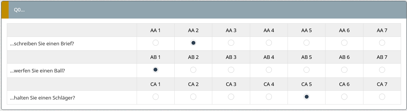 <script type="text/javascript" charset="utf-8"> $(document).ready(function() { // Identify this question var thisQuestion = $('#question{QID}'); // Define the sub-heading text strings var subHeading1 = '<th></th><th>AA 1</th><th>AA 2</th><th>AA 3</th><th>AA 4</th><th>AA 5</th><th>AA 6</th><th>AA 7</th>'; var subHeading2 = '<th></th><th>AB 1</th><th>AB 2</th><th>AB 3</th><th>AB 4</th><th>AB 5</th><th>AB 6</th><th>AB 7</th>'; var subHeading3 = '<th></th><th>CA 1</th><th>CA 2</th><th>CA 3</th><th>CA 4</th><th>CA 5</th><th>CA 6</th><th>CA 7</th>'; // Insert the new rows $('tr.answers-list:eq(0)', thisQuestion).before('<tr class="sub-header-row">'+subHeading1+'</tr>'); $('tr.answers-list:eq(1)', thisQuestion).before('<tr class="sub-header-row">'+subHeading2+'</tr>'); $('tr.answers-list:eq(2)', thisQuestion).before('<tr class="sub-header-row">'+subHeading3+'</tr>'); // Fix up the row classes var rowClass = 1; $('table.subquestions-list tbody tr', thisQuestion).each(function(i) { if($(this).hasClass('sub-header-row')) { rowClass = 1 } else { rowClass++; $(this).removeClass('array1 array2') if(rowClass % 2 == 0) { $(this).addClass('array2'); } else { $(this).addClass('array1'); } } }); }); </script>