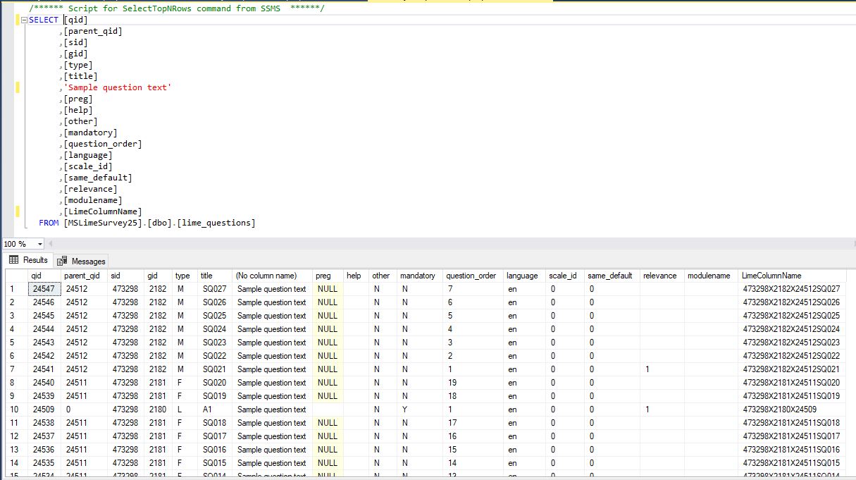 DECLARE @surveyid varchar(50) SET @surveyid = 'ENTER YOUR SID HERE' DECLARE @importquestions as varchar(3000) SET @importquestions = 'SELECT * INTO MSLimeSurvey25.dbo.lime_questions FROM openquery(LIMESURVEY25, ''SELECT * FROM limesurvey25.lime_questions WHERE language=''''en'''' AND sid='+@surveyid+''')' EXEC(@importquestions) IF COL_LENGTH('dbo.[lime_questions]','LimeColumnName') IS NULL BEGIN ALTER TABLE dbo.[lime_questions] ADD LimeColumnName nvarchar(128) END UPDATE [dbo].[lime_questions] SET [LimeColumnName] = cast([sid] as varchar(50))+'X'+cast([gid] as varchar(50))+(case when [parent_qid] = 0 then 'X'+ cast([qid] as varchar(50)) ELSE 'X'+ cast([parent_qid] as varchar(50))+[title] END) IF COL_LENGTH('dbo.[lime_questions]','question') IS NOT NULL BEGIN ALTER TABLE dbo.[lime_questions] Alter Column question varchar(MAX) END