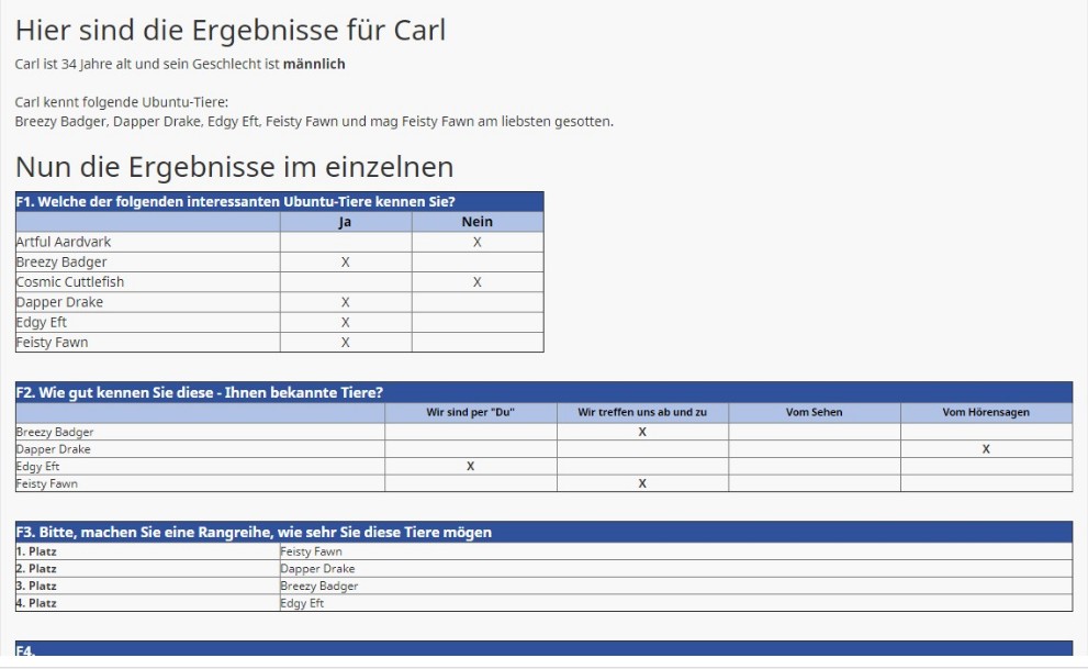 <?php require_once 'jsonrpcphp/JsonRPCClient.php'; define( 'LS_BASEURL', 'https://www.myServer.de/limesurvey'); // adjust this one to your actual LimeSurvey URL define( 'LS_USER', 'ICH_ICH' ); define( 'LS_PASSWORD', 'meinPassword' ); // the survey to process $survey_id=886223; // instantiate a new client $myJSONRPCClient = new \org\jsonrpcphp\JsonRPCClient( LS_BASEURL.'/index.php/admin/remotecontrol' ); // receive session key $sessionKey= $myJSONRPCClient->get_session_key( LS_USER, LS_PASSWORD ); if(is_array($sessionKey)) { header("Content-type: application/json"); echo json_encode($sessionKey); die(); } /* Get the responses */ /* export_responses( string $sSessionKey, integer $iSurveyID, string $sDocumentType, string $sLanguageCode = null, string $sCompletionStatus = 'all', string $sHeadingType = 'code', string $sResponseType = 'short', integer $iFromResponseID = null, integer $iToResponseID = null, array $aFields = null ) : array|string */ $response = $myJSONRPCClient->export_responses( $sessionKey, $survey_id, 'json', // Document type : pdf,csv,xls,doc,json null, // Language code : null : default from survey 'complete', // Stautus complete|incomplete|all NULL, // Heading : code|full|abbreviated : question text, default code 'short', // answer : short|long , default : long $SID, // die übergebene SAVEDID als Startwert $SID // die übergebene SAVEDID als Endwert ); // See https://api.limesurvey.org/classes/remotecontrol_handle.html#method_export_responses or https://github.com/LimeSurvey/LimeSurvey/blob/master/application/helpers/remotecontrol/remotecontrol_handle.php#L2382 or $decodedString = base64_decode($response); $aResponses = json_decode($decodedString, True); // Find the first response ID $aFirstResponse = reset($aResponses['responses'][0]); //Hier als Tabelle auf den Bildschirm gebracht. echo '<table style="border-collapse: collapse; text-align: left;">'; echo '<tr>'; // Insert column headers foreach($aFirstResponse as $key => $value) { echo '<th style="border: 1px solid #CCC; padding: 2px 7px;">'.$key .'</th>'; } echo '</tr>'; foreach($aResponses['responses'] as $key => $row) { echo '<tr>'; // Insert the data foreach(reset($row) as $key => $item) { echo '<td style="border: 1px solid #CCC; padding: 2px 7px;">'.$item .'</td>'; } echo '</tr>'; } echo '</table>'; // release the session key $myJSONRPCClient->release_session_key( $sessionKey ); ?>