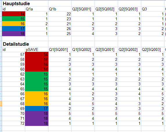 Diese wird an die zweite Studie übergeben, hier als Variable "pSAVE". Und in dieser zweiten Umfrage siehst Du nun verschieden viele Datensätze mit diesem Wert.