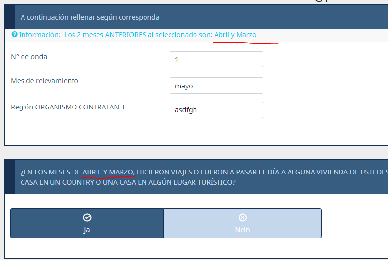 ,"Febrero y Enero",if(Q1_Y002==4,"Marzo y Febrero",if(Q1_Y002==5,"Abril y Marzo",if(Q1_Y002==6,"Mayo y Abril",if(Q1_Y002==7,"Junio y Mayo",if(Q1_Y002==8,"Julio y Junio",...)))))}<script type="text/javascript" charset="utf-8"> $(document).on('ready pjax:complete',function() { var qID = {QID}; var inputNum = 2; // Define the select element (dropdown) var prov1 = '<select id="prov1" class="form-control">\ <option value="">--Elije el mes--</option>\ <option value="1">enero</option>\ <option value="2">febrero</option>\ <option value="3">marzo</option>\ <option value="4">abril</option>\ <option value="5">mayo</option>\ <option value="6">junio</option>\ <option value="7">julio</option>\ <option value="8">agosto</option>\ <option value="9">septiembre</option>\ <option value="10">octubre</option>\ <option value="11">noviembre</option>\ <option value="12">diciembre</option>\ </select>'; // Hide the text input $('#question'+qID+' .question-item:eq('+(inputNum-1)+') input[type="text"]').hide(); // Insert the select elements if($('#question'+qID+' .question-item:eq('+(inputNum-1)+') select').length == 0) { $('#question'+qID+' .question-item:eq('+(inputNum-1)+') input[type="text"]').before(prov1); } // Initially select an option if the question has already been answered $('#question'+qID+' select').each(function(i) { if($.trim($(this).next('input[type="text"]').val()) != '') { $(this).val($.trim($(this).next('input[type="text"]').val())); } }); // Listener on the dropdowns - insert selected values into hidden text input $('#question'+qID+' select').change(function() { var thisInput = $(this).next('input[type="text"]'); $(thisInput).val($(this).val()); checkconditions($(thisInput).attr('value'), $(thisInput).attr('name'), 'text'); }); // Some styles $('#question'+qID+' select').css({ 'margin':'0.3em 0 0 0' }); }); </script>